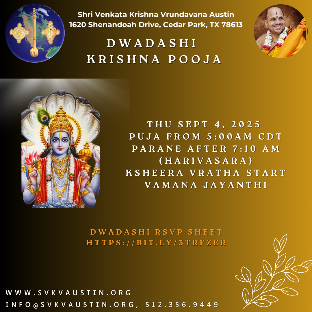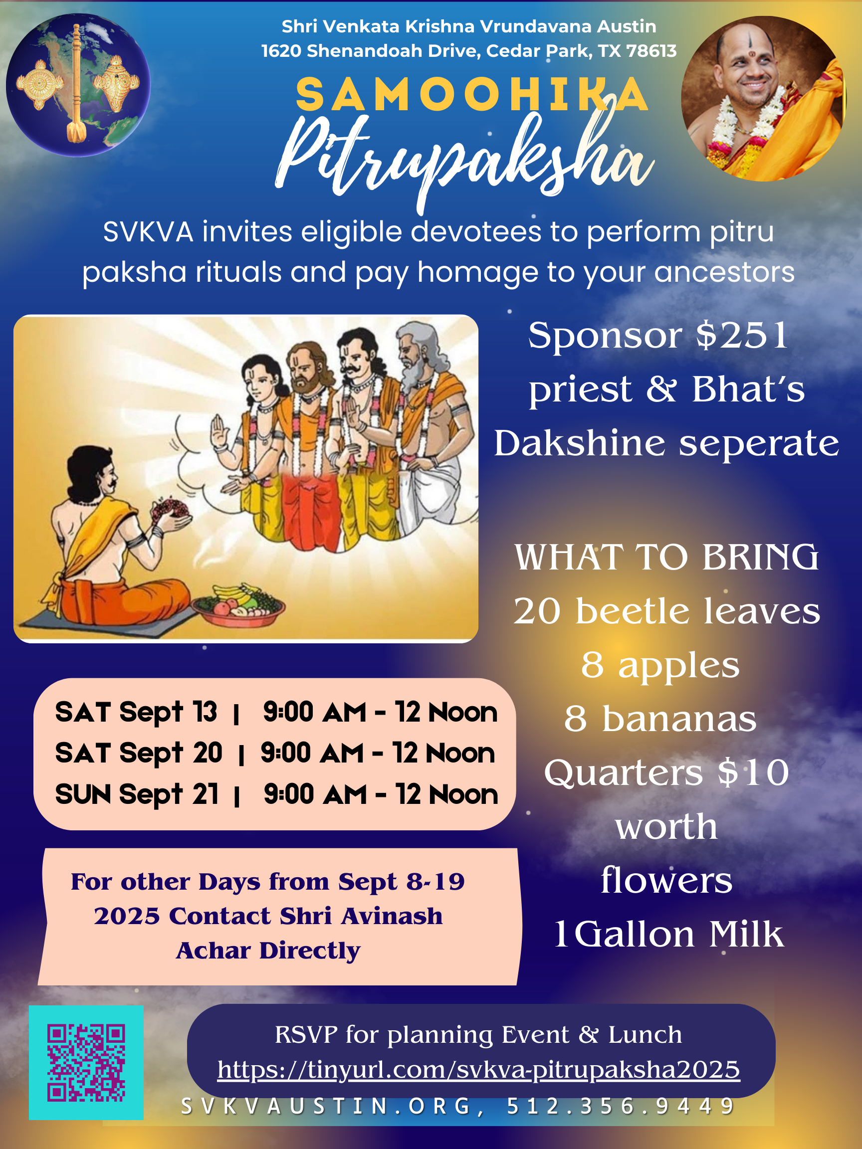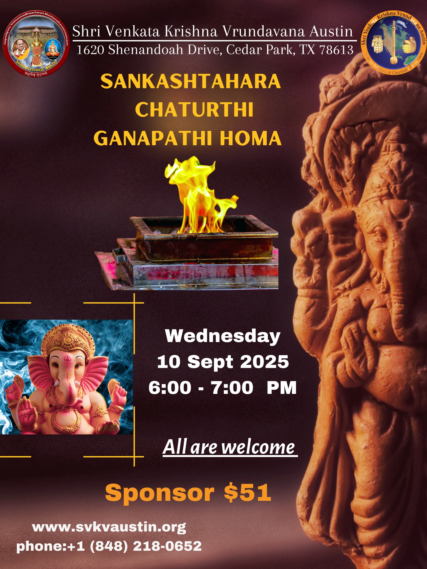 Priest House 1620 Shenandoah Drive, Cedar Park, United StatesVIJAYADASHAMI & MADVA JAYANTHI - Register for PAVAMANA HOMA. Dear Devotees SVKVA will celebrate PAVAMANA HOMA and Madhva Jayanthi on the Auspicious day of Vijaya Dashami. When: Oct 2 2025, 9:30AM - 12 Noon, followed by Mangalarthi and Prasadam. PAVAMANA HOMA SIGNUP: Register @ https://tinyurl.com/svkva-pavamana-homa Items to bring: Coconut | Fruits | Flowers | Any Anna Dana Items Participate and get the blessings. Please contact Avinash Achar directly for further information, sponsor and any requests Seva Sponsor : Contact Avinash Acharya ($151 suggested) 🙏 General Donations: https://svkvaustin.org/donate/ Note: Please offer Priest Dakshina separately in person or via Zelle (8482180652) or Paypal ([email protected])