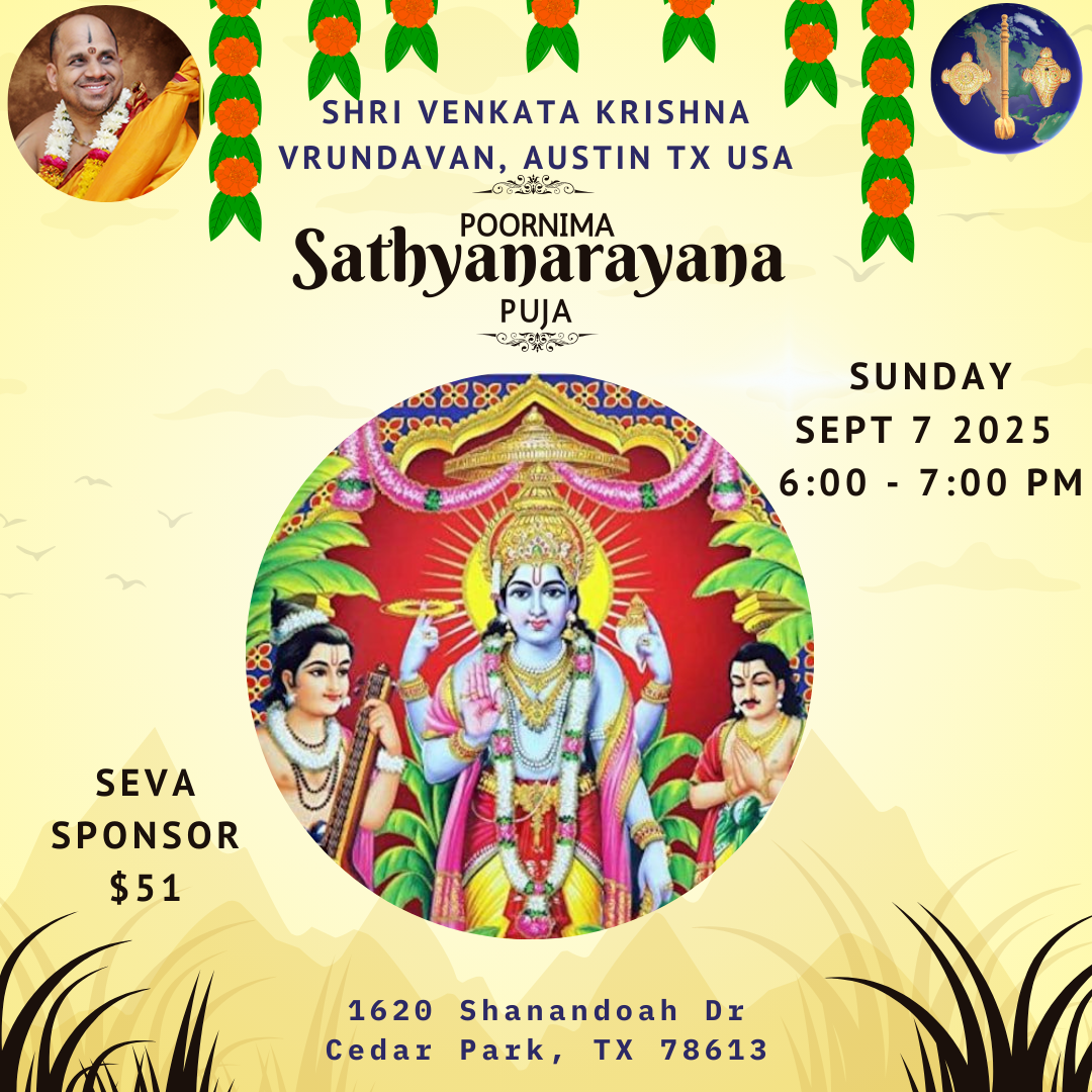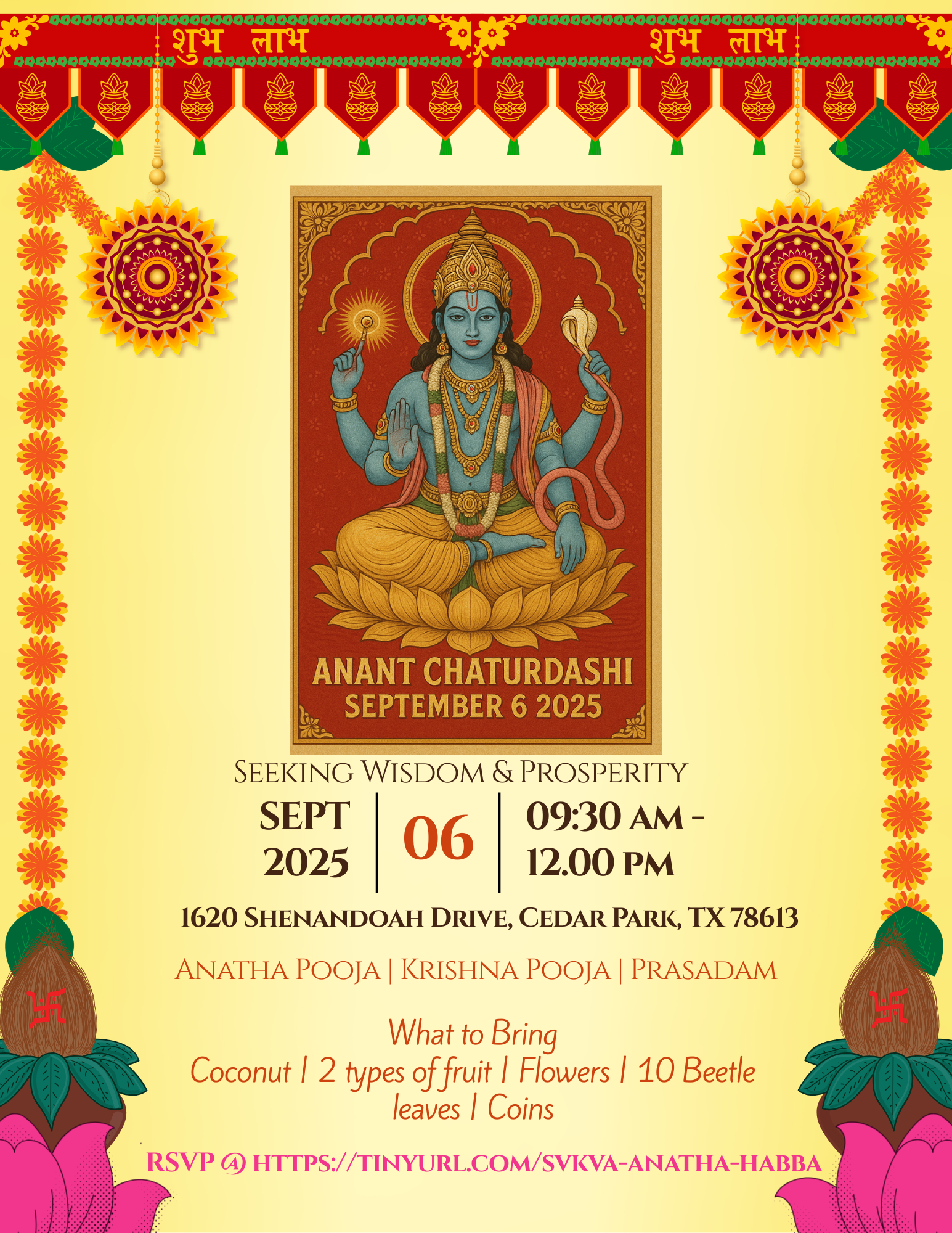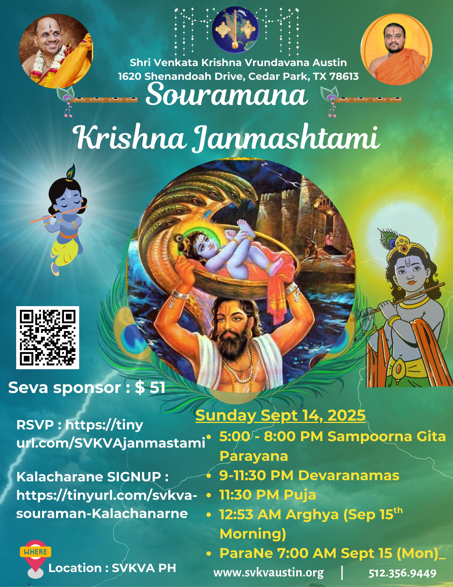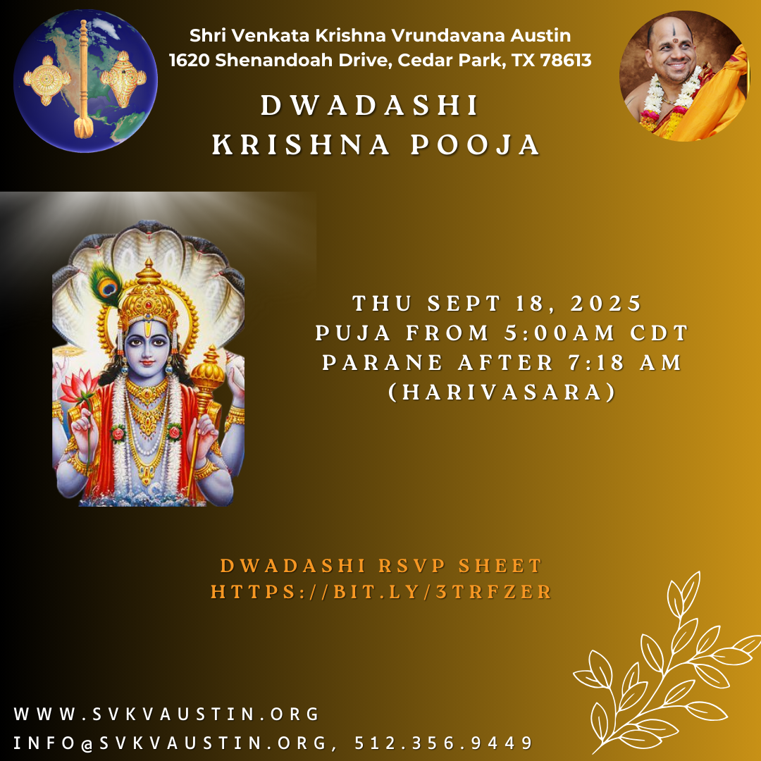 Priest House 1620 Shenandoah Drive, Cedar Park, United StatesVIJAYADASHAMI & MADVA JAYANTHI - Register for PAVAMANA HOMA. Dear Devotees SVKVA will celebrate PAVAMANA HOMA and Madhva Jayanthi on the Auspicious day of Vijaya Dashami. When: Oct 2 2025, 9:30AM - 12 Noon, followed by Mangalarthi and Prasadam. PAVAMANA HOMA SIGNUP: Register @ https://tinyurl.com/svkva-pavamana-homa Items to bring: Coconut | Fruits | Flowers | Any Anna Dana Items Participate and get the blessings. Please contact Avinash Achar directly for further information, sponsor and any requests Seva Sponsor : Contact Avinash Acharya ($151 suggested) 🙏 General Donations: https://svkvaustin.org/donate/ Note: Please offer Priest Dakshina separately in person or via Zelle (8482180652) or Paypal ([email protected])