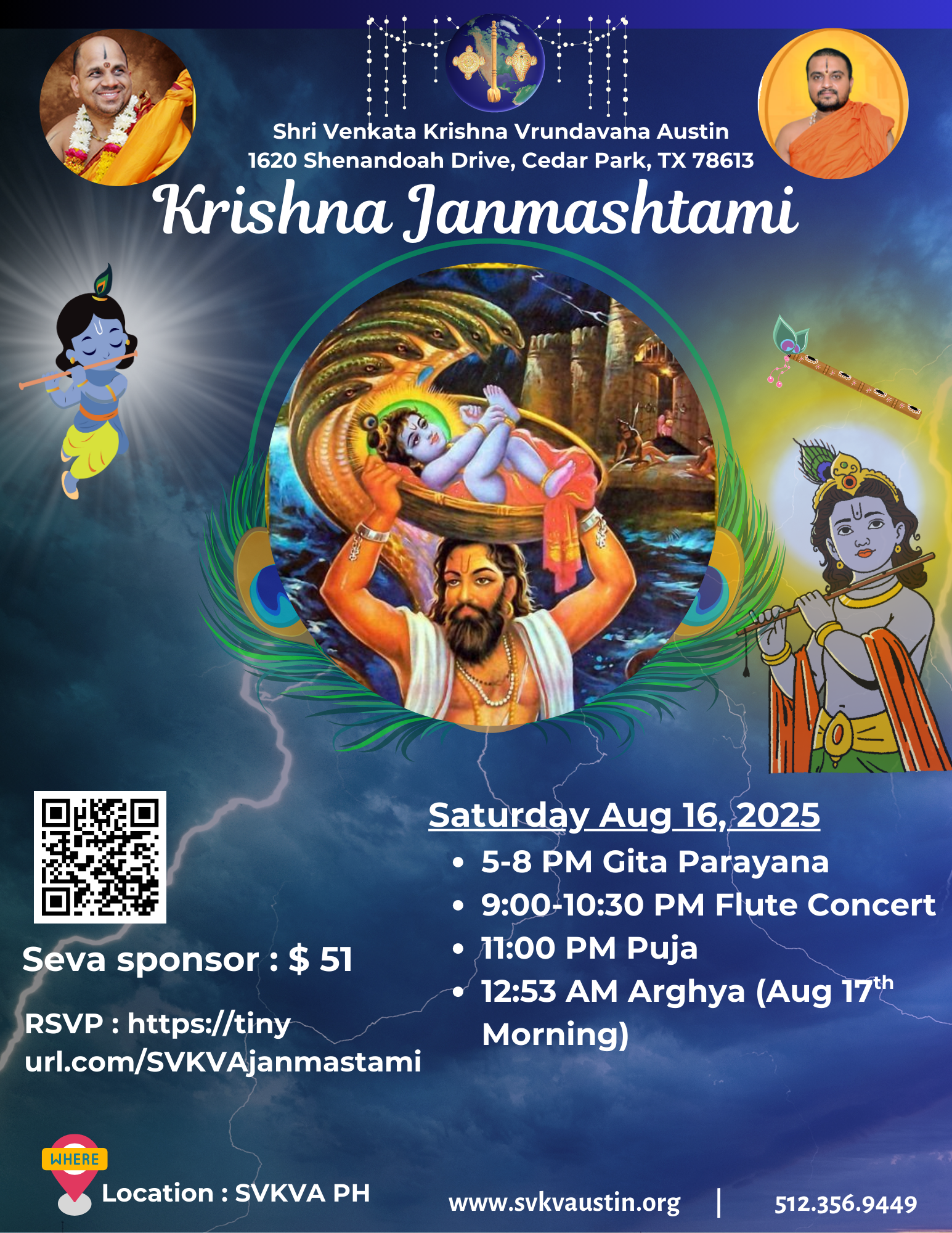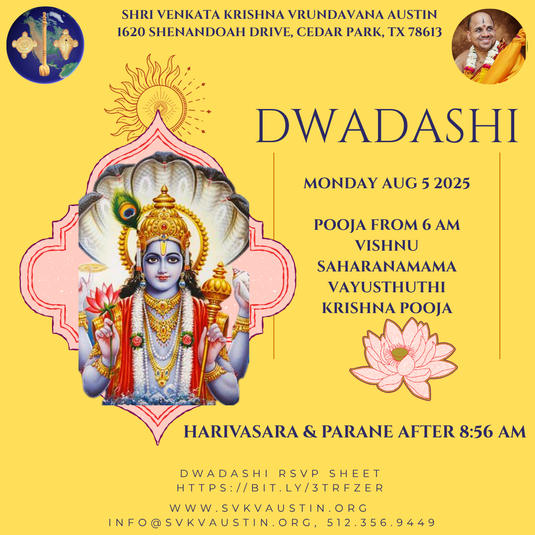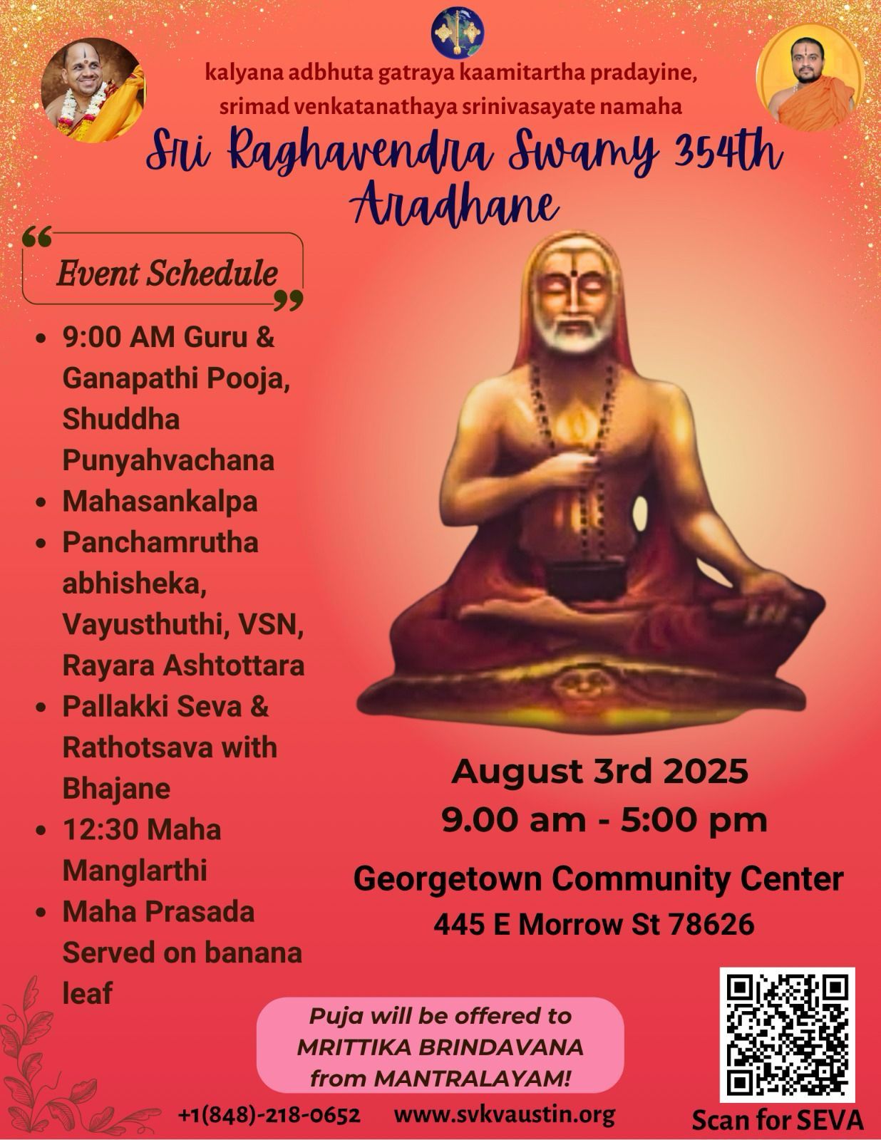 Sri Raghavendra Swamy 354th Aradhana Mahotsava @ SVKVA PH - Sat 9th Aug, Sun 10th Aug and Mon 11th Aug 2025 Namaskara to all the bhaktas🙏🏽 With blessings from Shri Sugunendra Theertha Swamiji we are going to celebrate Sri Raghvendra Swamigala Aradhane in 2025 at SVKV Priest House on Aug 9th-11th. Due to parking limitations at PH, we are requesting devotees to attend MORNING POOJA one of the days ONLY🙏🏽 Please RSVP if you are coming: https://forms.gle/2SqMqCEzLB3wQaez6 If you are performing Kalarchane during EVENINGS please RSVP SEPARATELY HERE: https://docs.google.com/spreadsheets/d/1Msnr9y4OCBHwFYwBGCbTatlrx3zT8oRf0MVfb9E6DWg/edit?gid=0#gid=0 Venue: SVKV Priest House, 1620 Shenandoah Dr, Cedar Park, TX Any questions contact: Sri Avinash-Acharya : +1 (848) 218-0652 🙏🏼 SEVA SPONSORSHIP & VOLUNTEER SIGNUP: General Donation: https://svkvaustin.org/donate/ Please contact Avinash Achar directly +1 (848) 218-0652 for any special sponsorships or further information Note: Please offer Priest Dakshina separately in person or via Zelle (8482180652) or Paypal ([email protected])