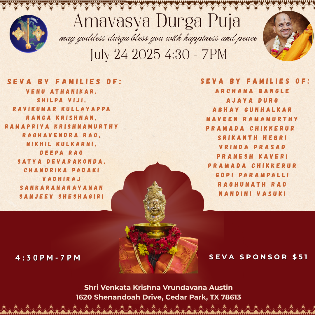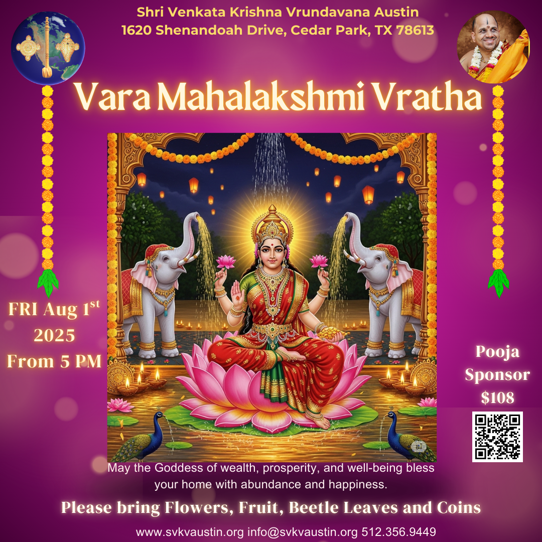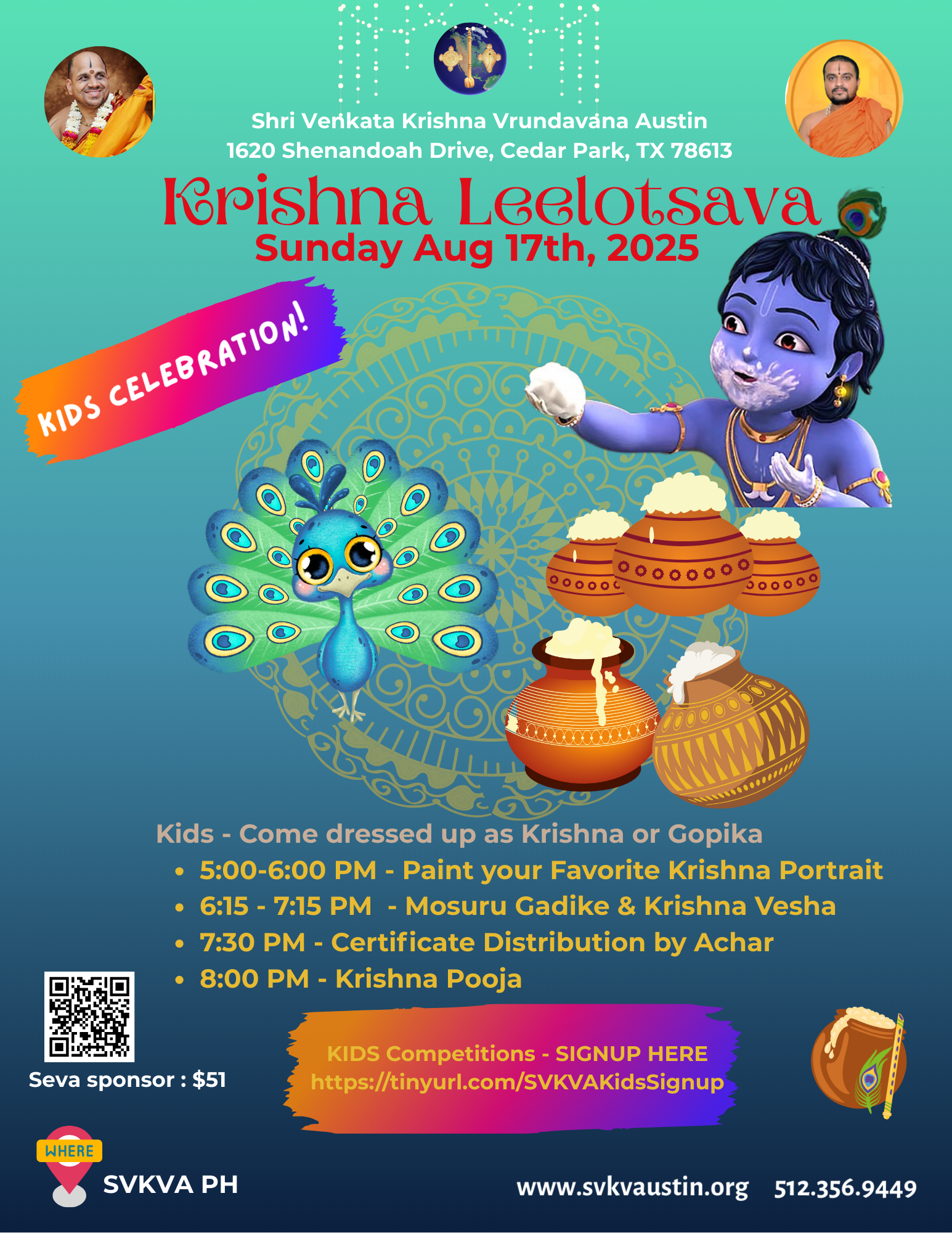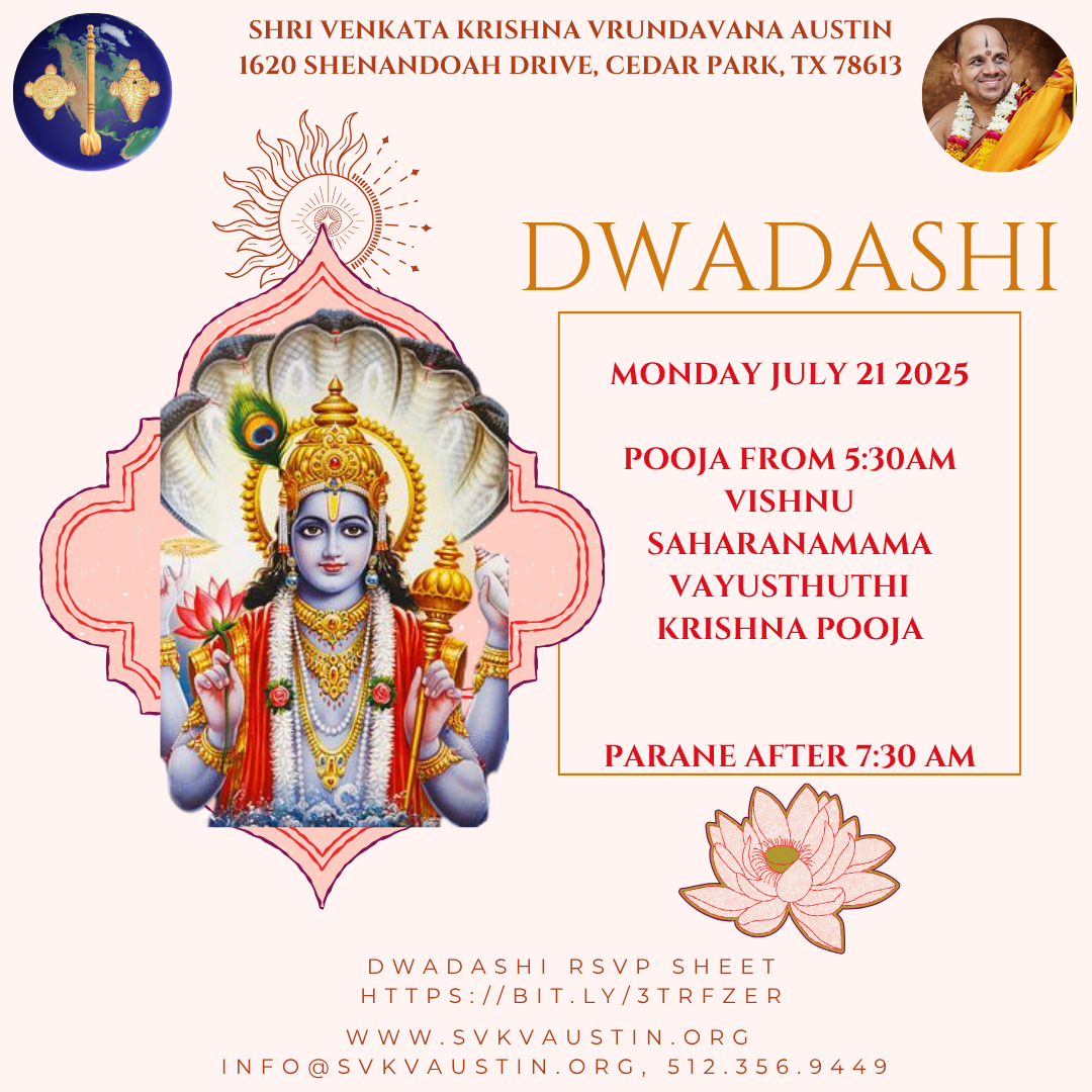 Sri Raghavendra Swamy 354th Aradhana Mahotsava @ SVKVA PH - Sat 9th Aug, Sun 10th Aug and Mon 11th Aug 2025 Namaskara to all the bhaktas🙏🏽 With blessings from Shri Sugunendra Theertha Swamiji we are going to celebrate Sri Raghvendra Swamigala Aradhane in 2025 at SVKV Priest House on Aug 9th-11th. Due to parking limitations at PH, we are requesting devotees to attend MORNING POOJA one of the days ONLY🙏🏽 Please RSVP if you are coming: https://forms.gle/2SqMqCEzLB3wQaez6 If you are performing Kalarchane during EVENINGS please RSVP SEPARATELY HERE: https://docs.google.com/spreadsheets/d/1Msnr9y4OCBHwFYwBGCbTatlrx3zT8oRf0MVfb9E6DWg/edit?gid=0#gid=0 Venue: SVKV Priest House, 1620 Shenandoah Dr, Cedar Park, TX Any questions contact: Sri Avinash-Acharya : +1 (848) 218-0652 🙏🏼 SEVA SPONSORSHIP & VOLUNTEER SIGNUP: General Donation: https://svkvaustin.org/donate/ Please contact Avinash Achar directly +1 (848) 218-0652 for any special sponsorships or further information Note: Please offer Priest Dakshina separately in person or via Zelle (8482180652) or Paypal ([email protected])