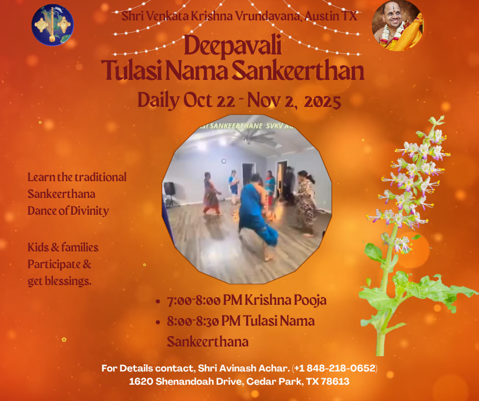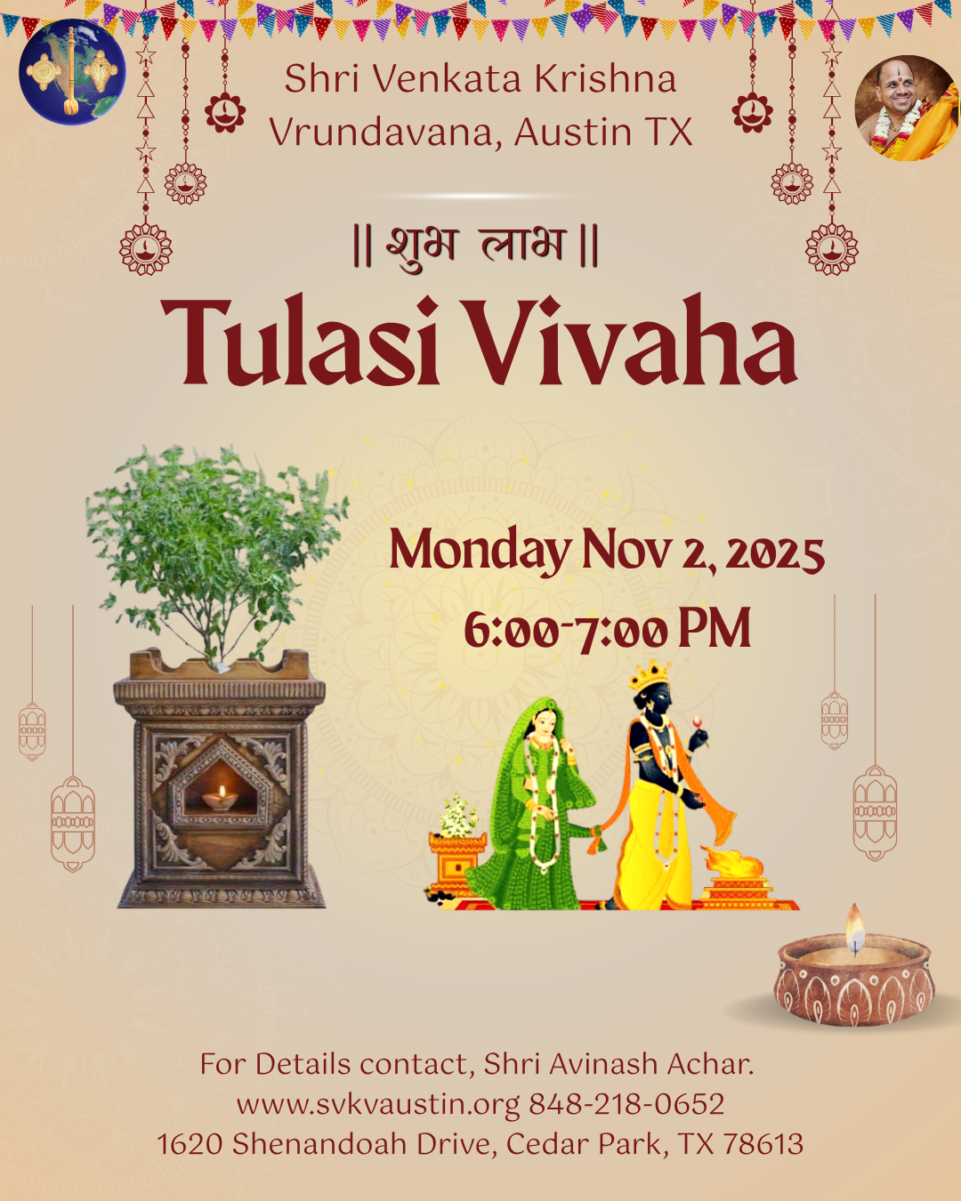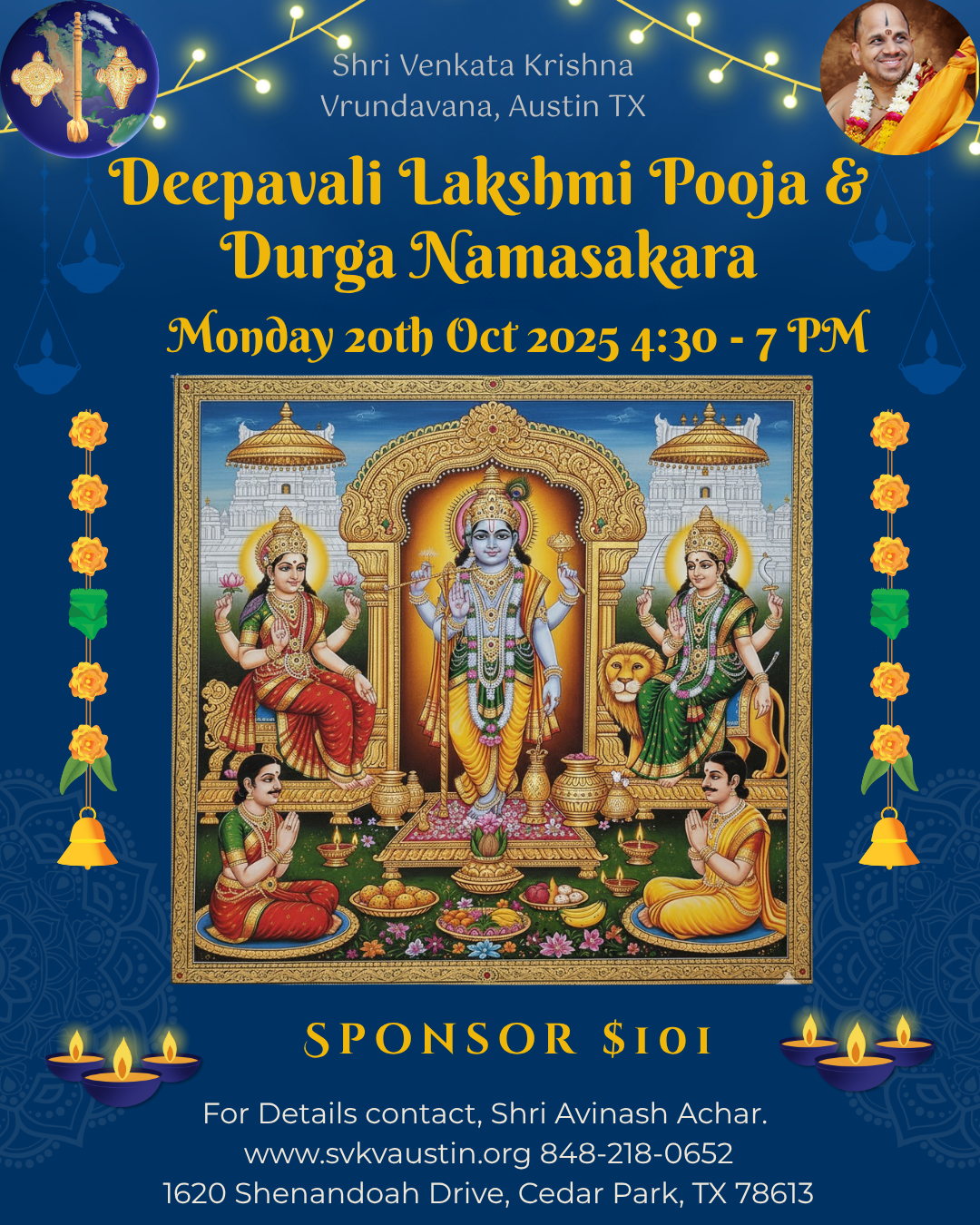 Priest House 1620 Shenandoah Drive, Cedar Park, United StatesDeepavali Sunday 19 Oct 2025 - Naraka Chaturdashi, ThilaAbhyangana Snana Muhurtha: 5:55AM Please contact Avinash Achar directly for further information, sponsor and any requests General Donations: https://svkvaustin.org/donate/ Note: Please offer Priest Dakshina separately in person or via Zelle (8482180652) or Paypal ([email protected])